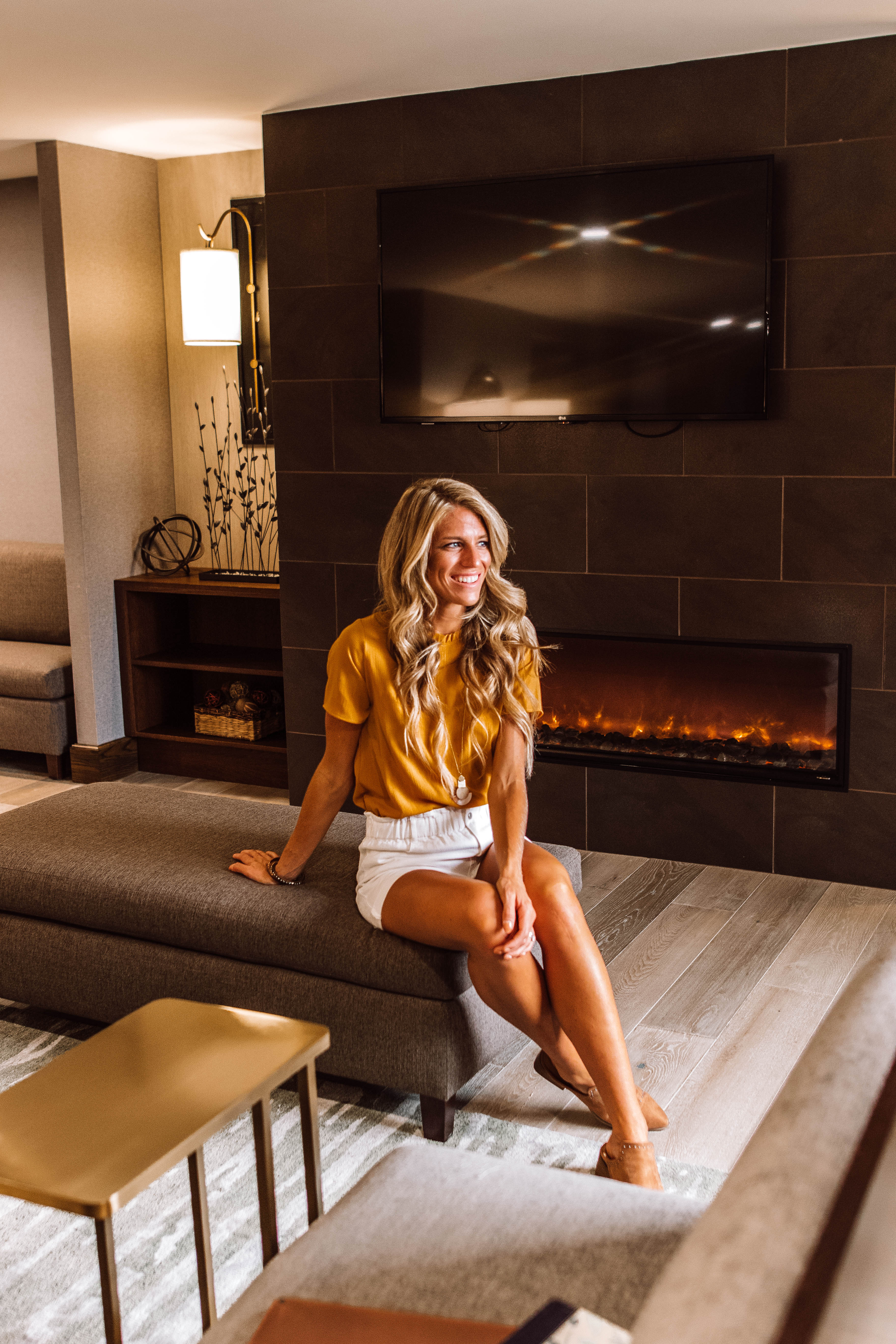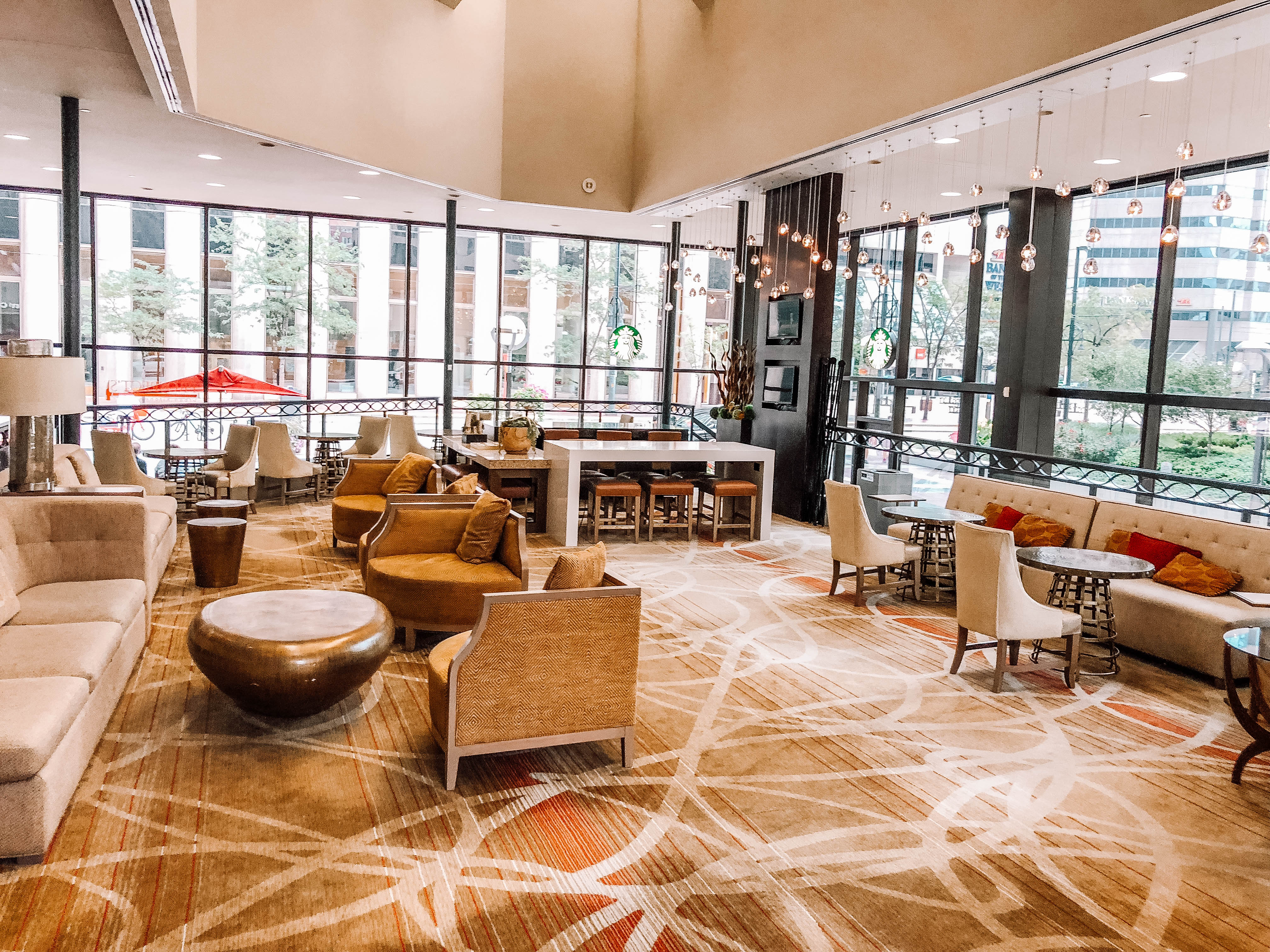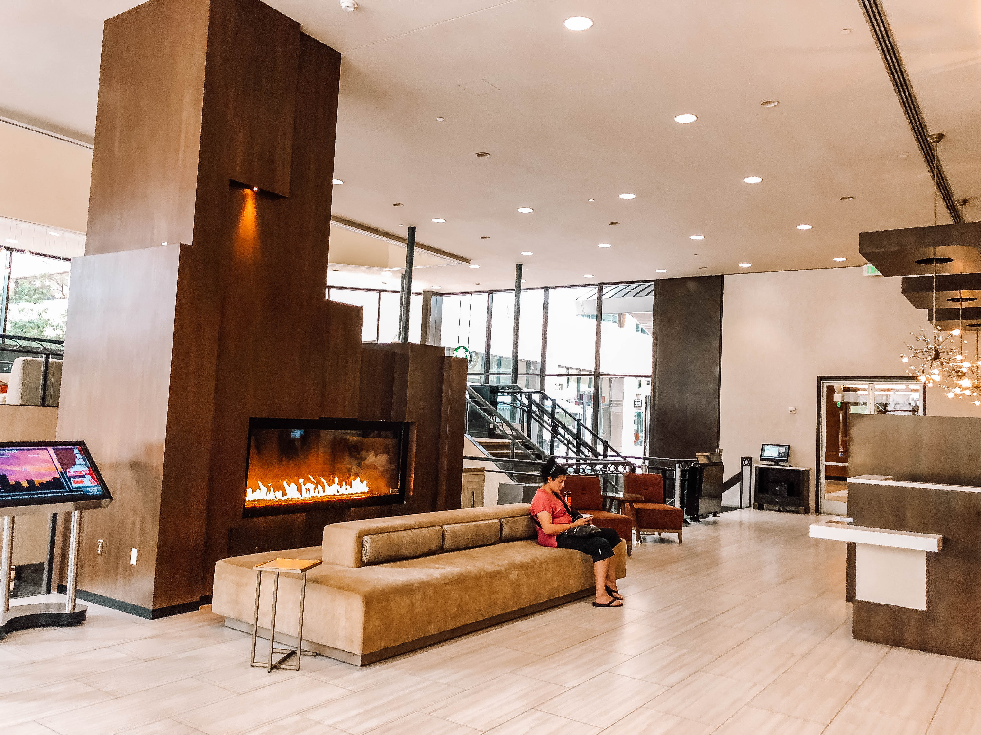 As we walked in everything was well lit with natural light.  The entire first floor has floor to ceiling windows.  I loved how bright and light all of the decor was.  I was immediately drawn to a large fireplace with a big comfy couch that was calling my name.  Not to mention there is a Starbuck’s right in the lobby!   Between the fire, the large couches, and the Starbucks I already felt at home.