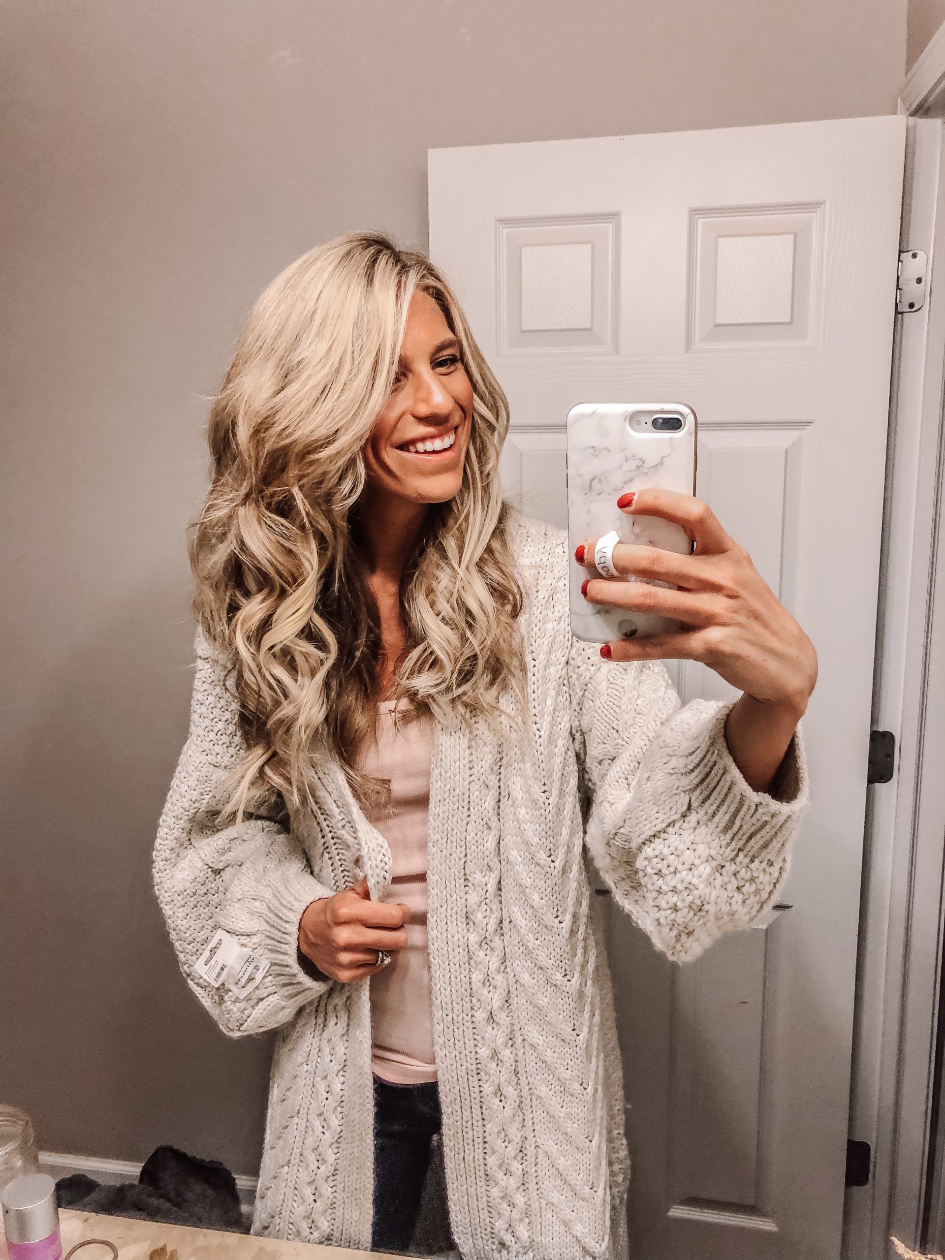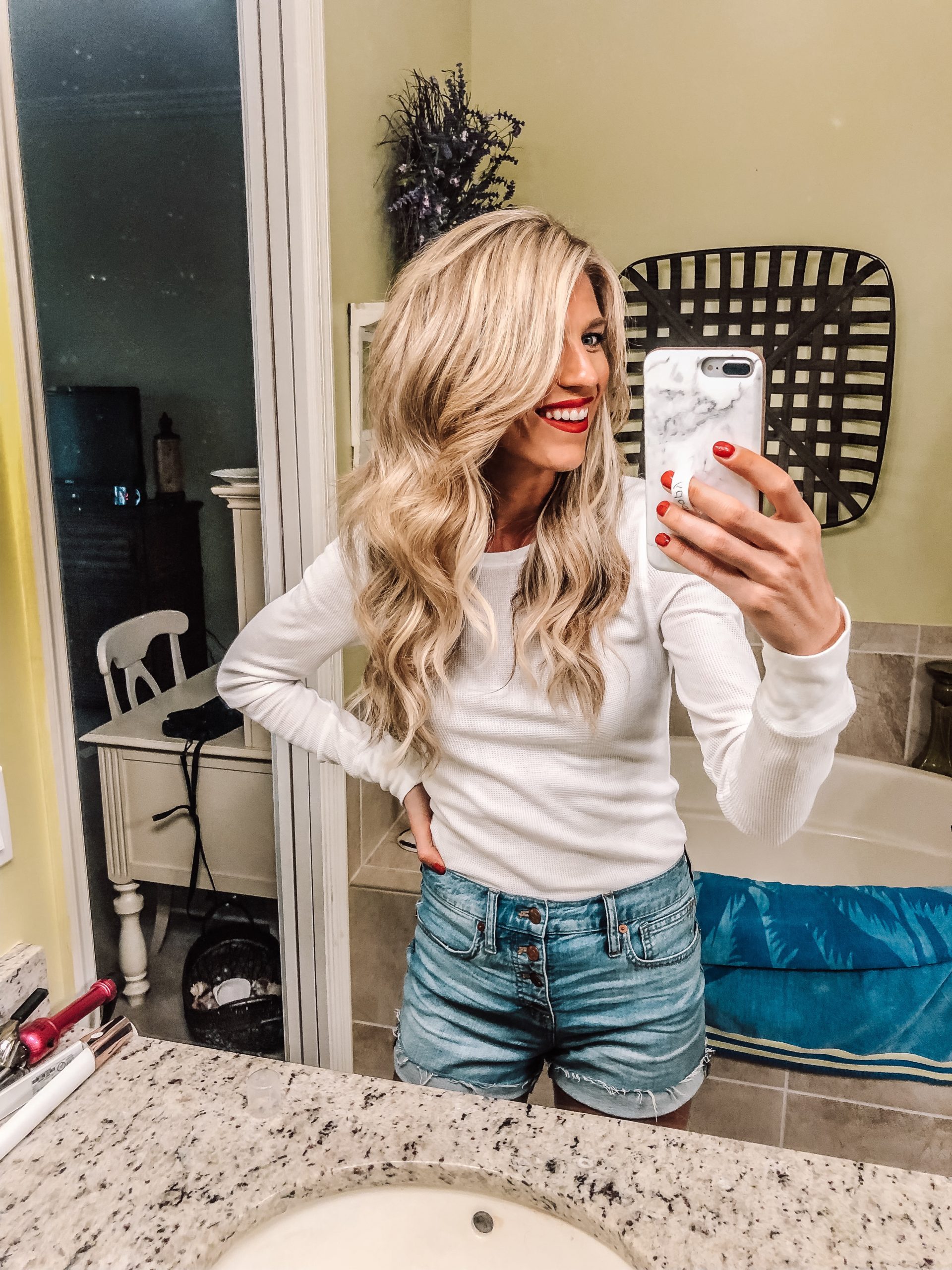 I personally have never tried the Beachwaver until a few weeks ago. I had a TON of requests on my Instagram to give a review for the Beachwaver. I also have a friend who has the best hair and swears by it. It only took me a few curls to instantly get used to using this curling iron. This curling iron is PERFECT for the girl who can’t figure out how to use a clip barrel or a wand to save her life. It is very hard to mess up your curls with this iron. It does it for you with the press of a button! I was very impressed with how easy it was to use. If you want those beach wave look, this tool is for you! The heat protectant spray is my new favorite. It literally smells like the beach and it is a light hairspray and heat protectant spray in one!