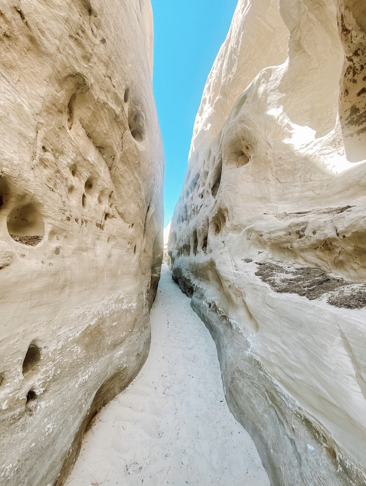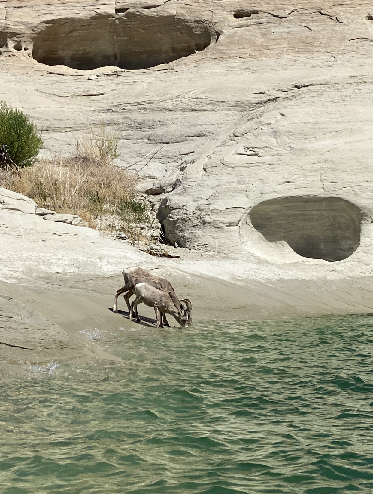 We originally planned on launching at Antelope Point Launch and kayaking to the Antelope Canyons but with the launch closed we decided to drive back over to Lone Rock Beach and launch our kayaks off the beach there and kayak over to Skull Canyon. On a quiet day or a non-busy weekend, this may be an easier trip over to Skull Canyon but since it was a holiday weekend this made the water pretty wavy making it more of a challenge. Regardless it is well worth it! If you get lucky you may even catch a sighting of the Dessert Big Horn Sheep climbing on the canyons (show below). As you kayak to Skull Canyon there’s a handful of areas to pull over and rest or go for a swim. When kayaking back into Skull Canyon, you will find twists and turns until you begin to see the water get muddy. Keep going until you come to a small beach area with weeds and you can’t go any longer. We had to walk in the mud a little bit, this is where I recommend wearing Chaco sandals.  Park your kayaks and start walking on the trail until you hit a dead end where the canyon comes to an end. This is a great area to get beautiful pictures of the narrow canyon.