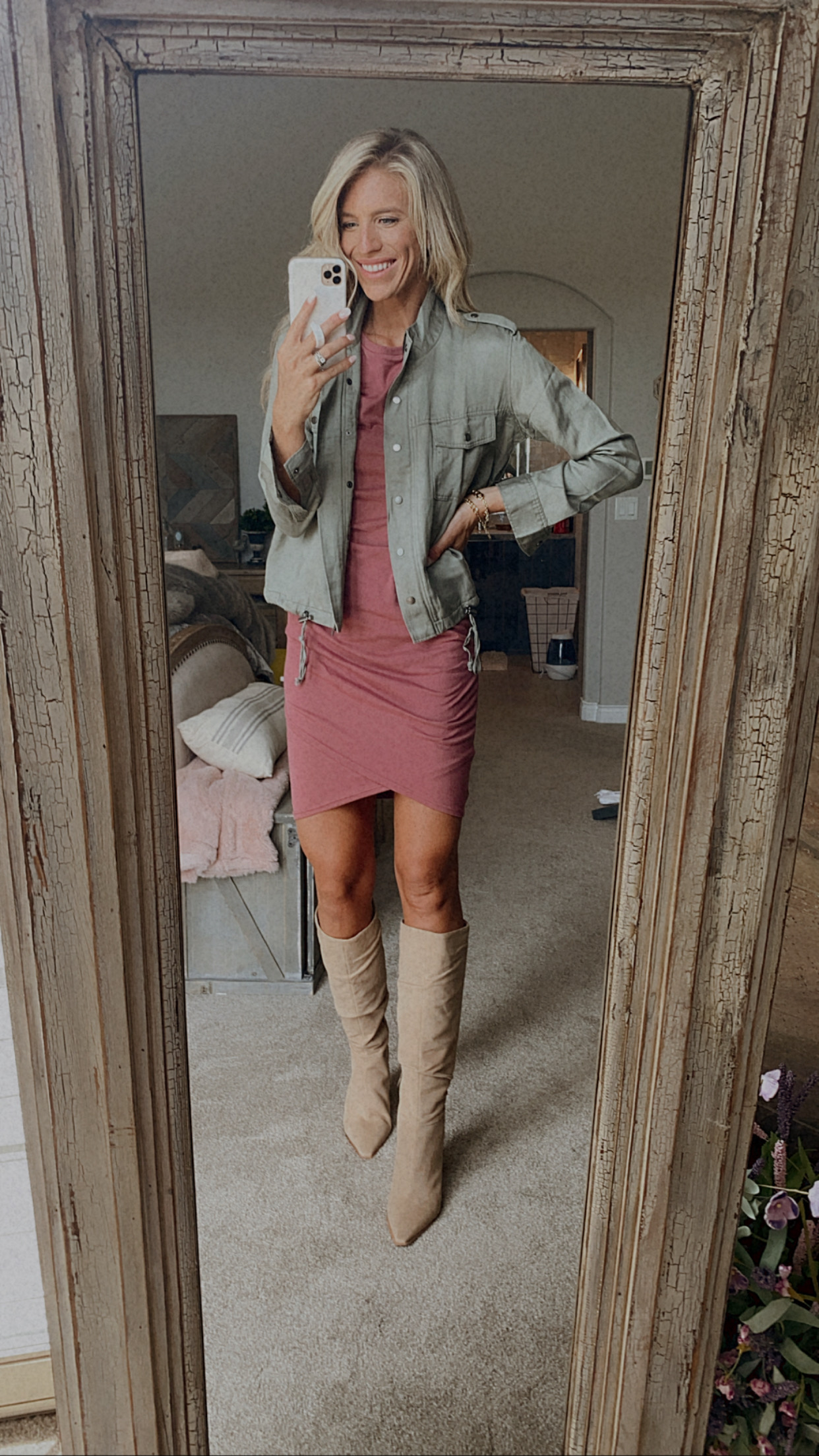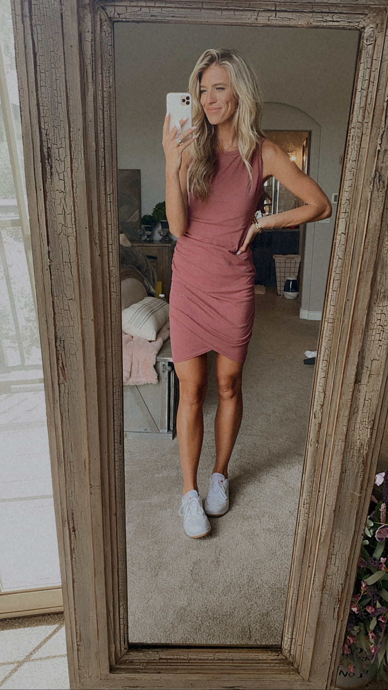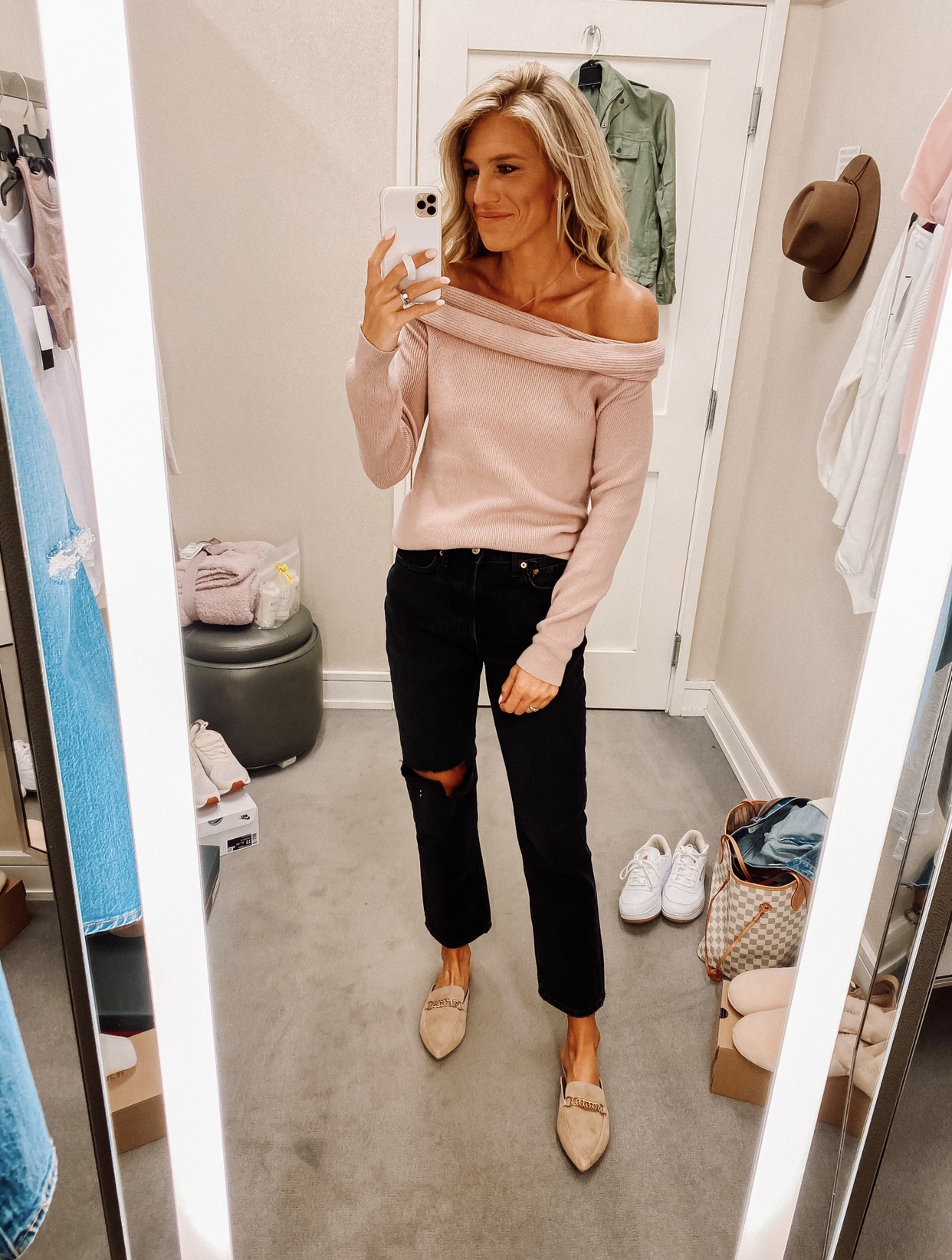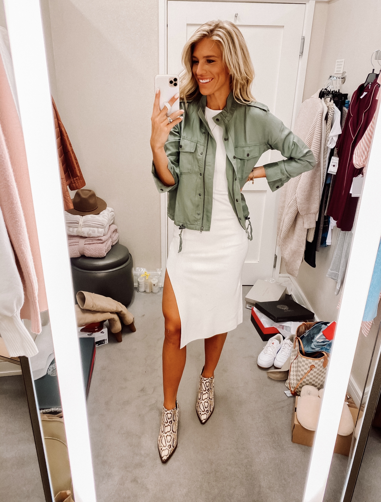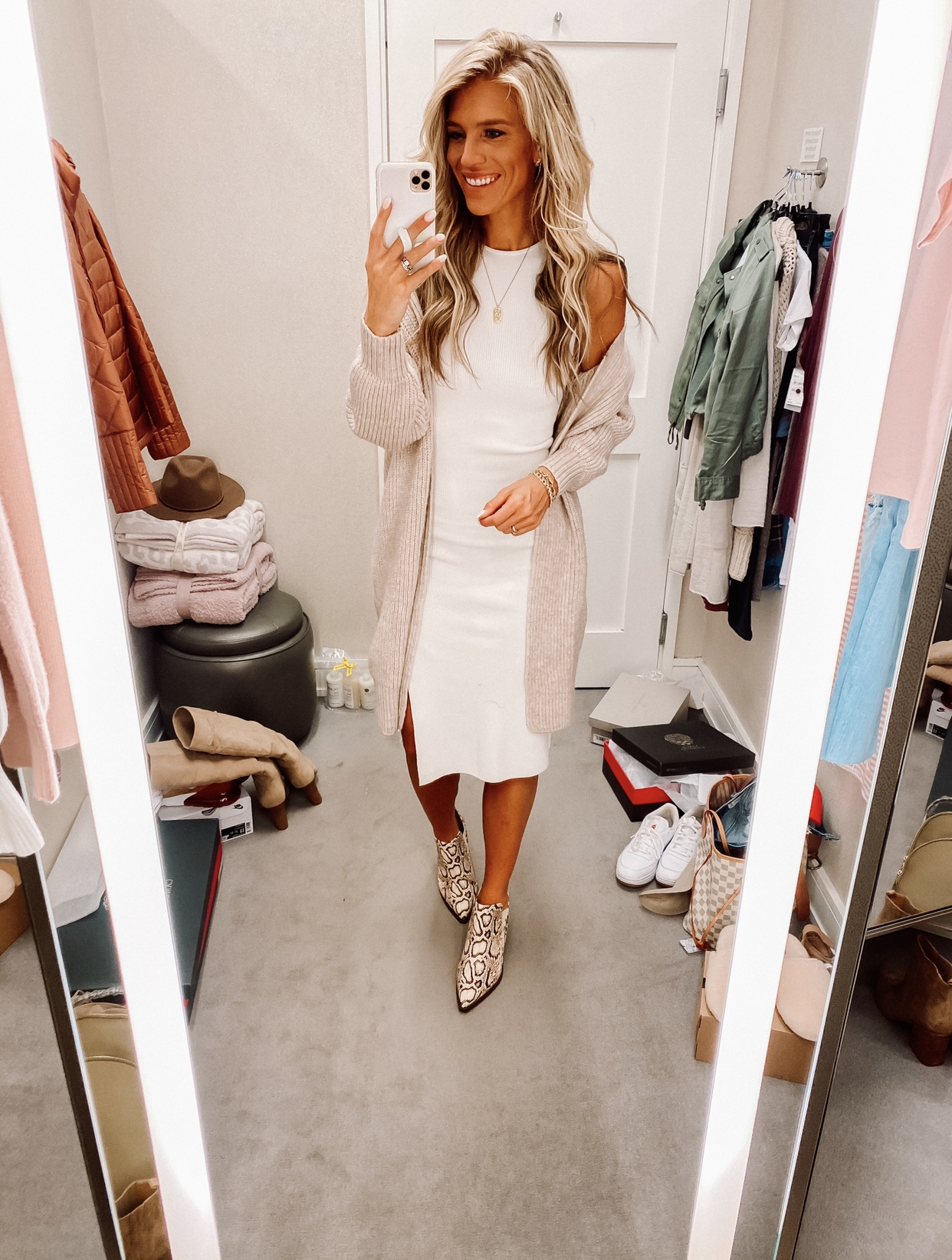 This dress can be worn in so many ways! Grabbed it in the greyish color too. Wearing a medium in the dress for length. I suggest sized up half size in shoes.