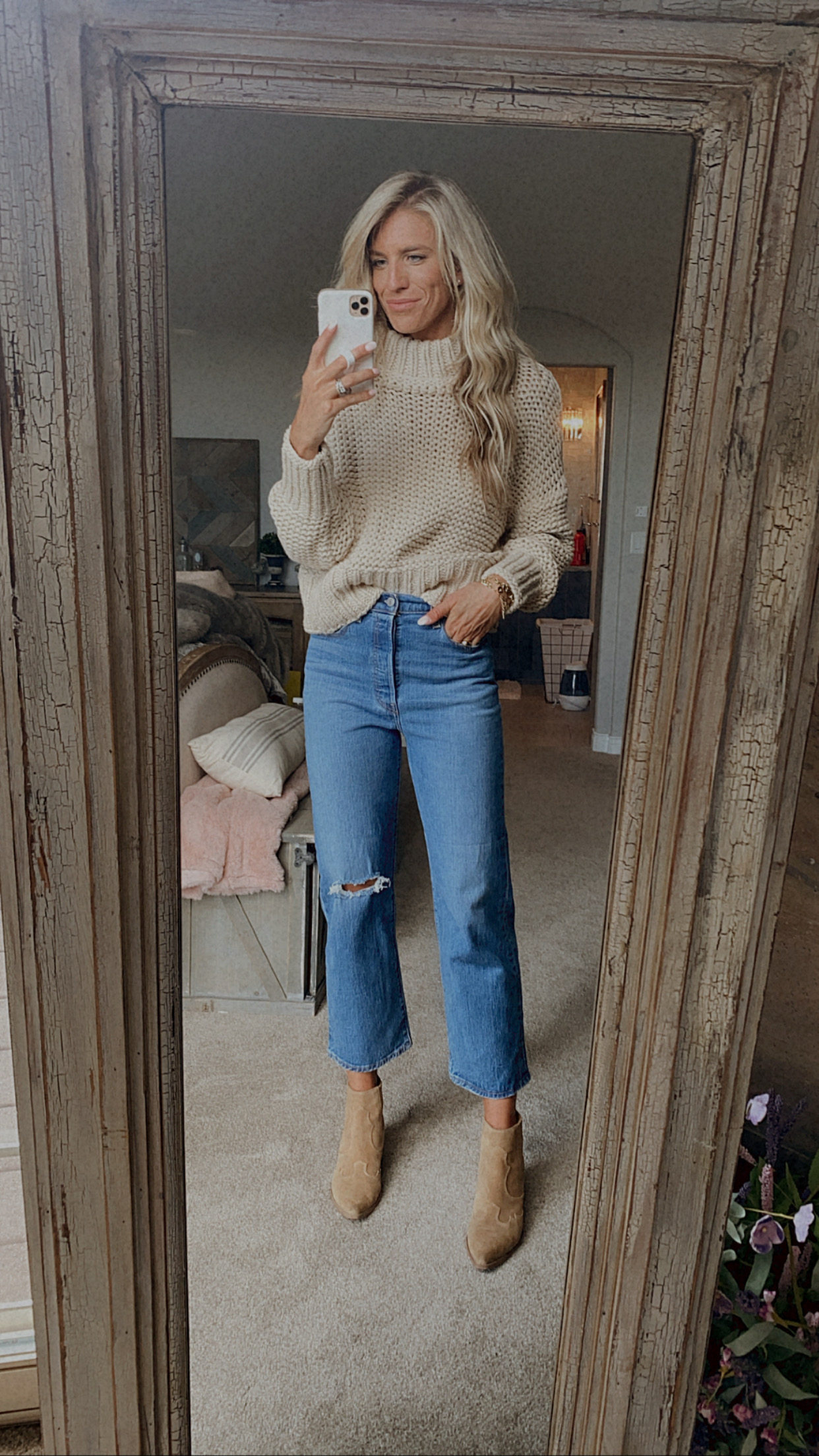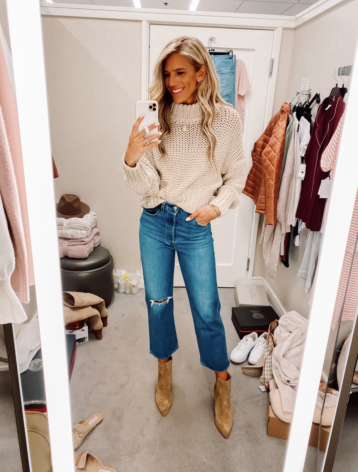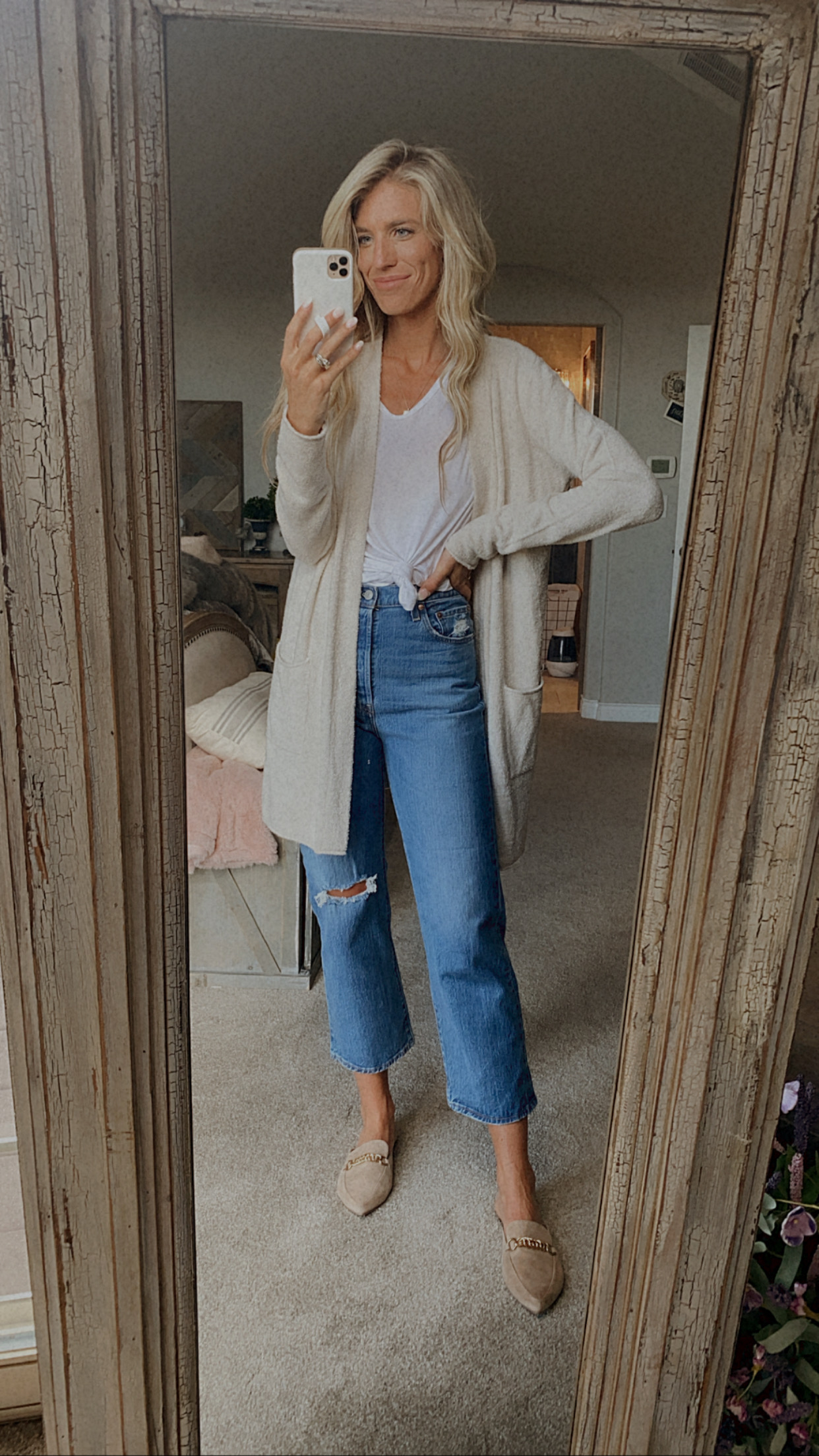 Sized up one size in the jeans to a 28, Get your true size if you want a more fitted jean. Wearing mediums in the cardigans because I wanted a looser fit, I could have gotten a small. Order up half size in the flats.