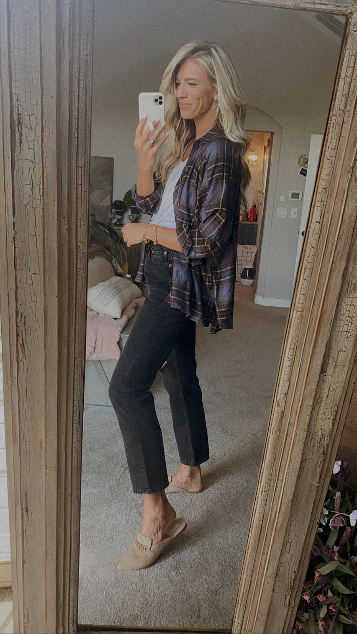 Wearing small in the flannel, jeans run bigger, size down if you want a more jean. Order up half size in the flats.