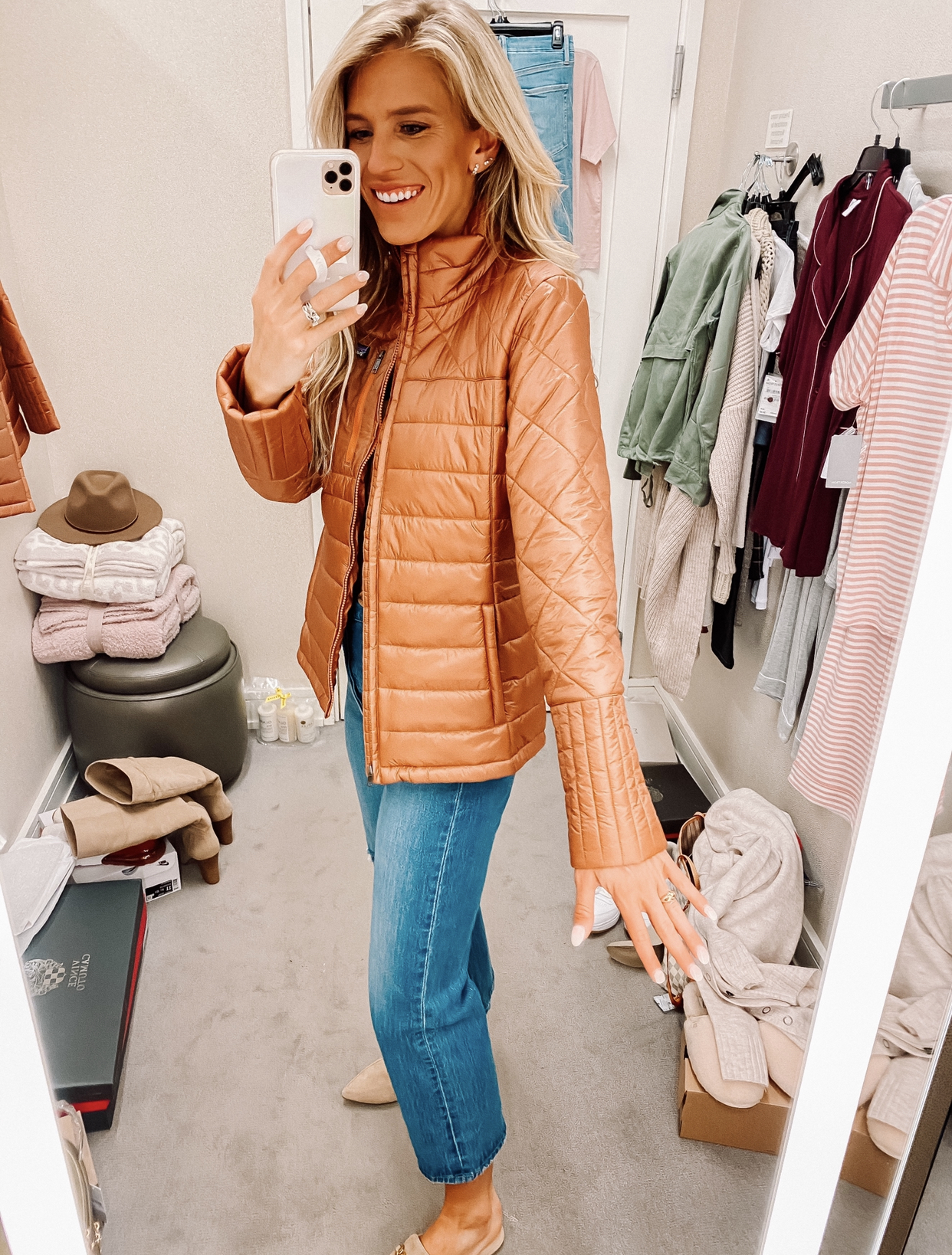 Jeans Run bigger, size down if you want a more fitted jean. I got my true size. Size up half size in the flats. Wearing a small in the jacket and tee.