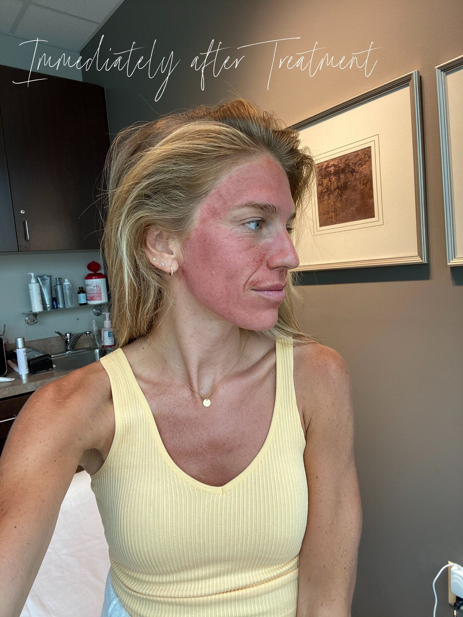 Your skin will be red for a few days and will feel like a small sunburn for a couple days after treatment. You cannot wear makeup the first day. It is also a good idea to stay away from harsh ingredients in your skincare…do not exfoliate! It is better to go as long as you can without makeup but after one day is good enough. Make sure you stay out of the sun the first few days and wear plenty of sunscreen because your skin is more sensitive. Your skin will be completely back to normal a week after treatment.