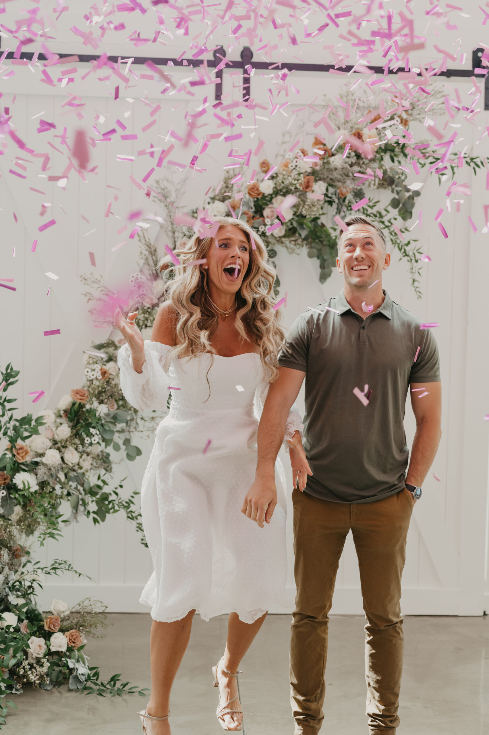 I knew I wanted to do confetti poppers when we revealed the gender but we wanted to make sure it would show up in photos and videos. It was perfect!! We got the confetti poppers online from Super Celebrations and its the Luxe two sided paper with shimmer confetti cannons! We used about 20 at the official reveal and an additional 6-8 afterwards for photos and video.